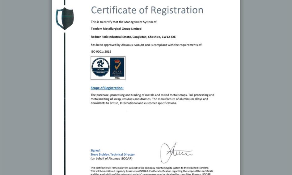 Tandom Metallurgical is committed to operating to the highest standard for the benefit of all interested parties. Our management system is independently accredited by ISOQAR Accredited Certification Body to the latest quality standard ISO 9001:2015.